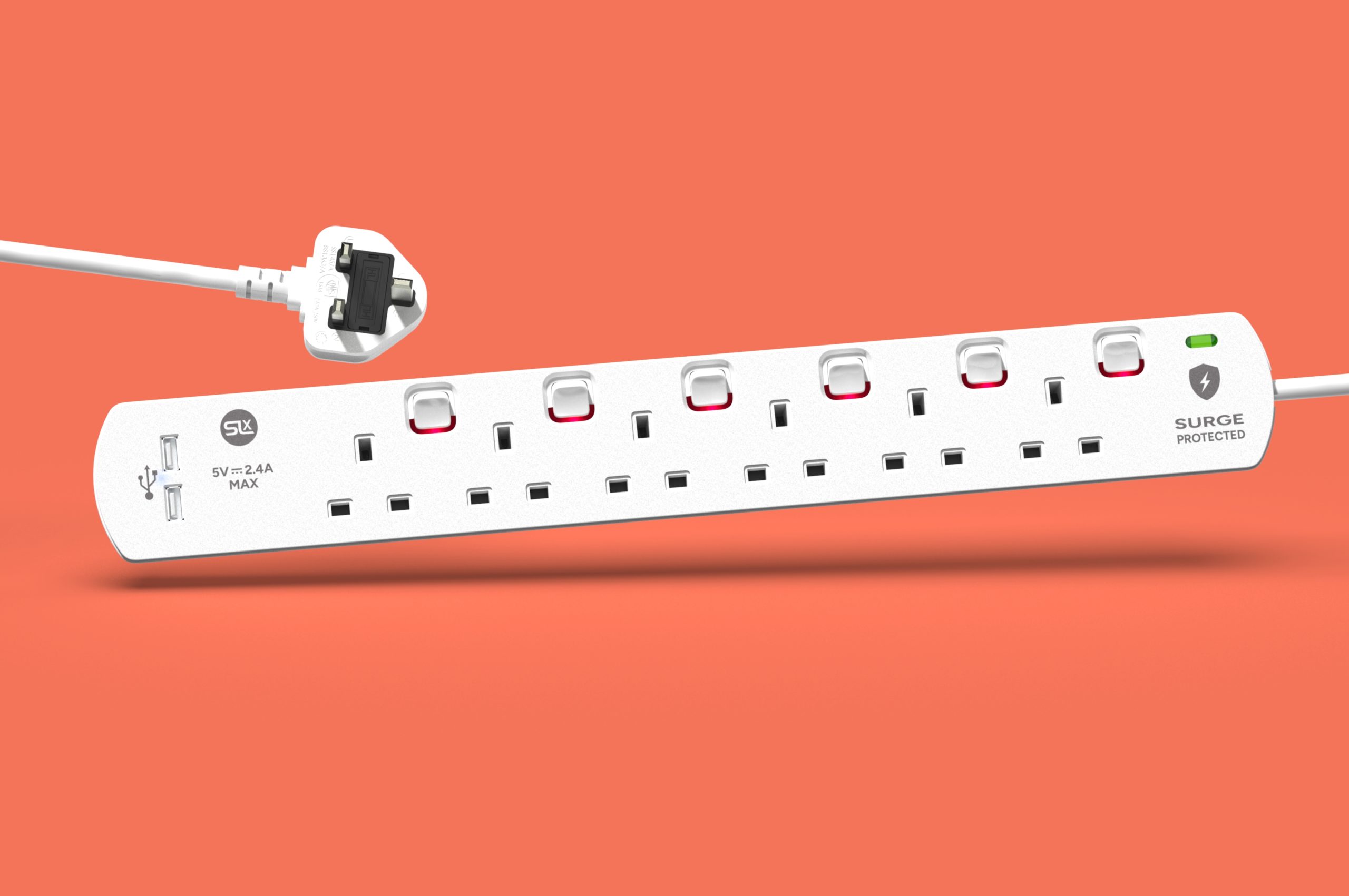 6 Gang Extension Lead 1m – (USB, Switched, Surge Protected & Neon)