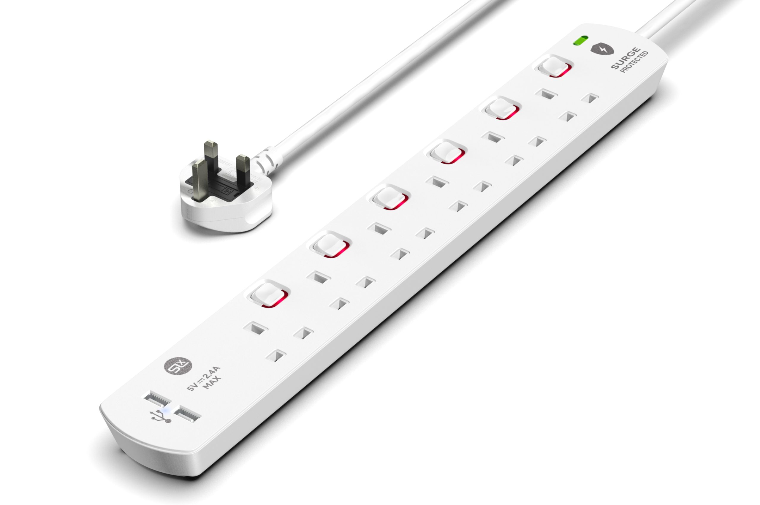 6 Gang Extension Lead 2m – (USB, Switched, Surge Protected & Neon)