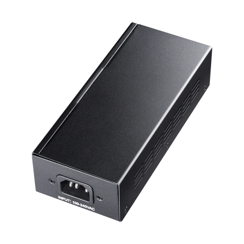 Metal casing PoE adapter injecting up to 60W power to the Ethernet cable to power up the PoE device.